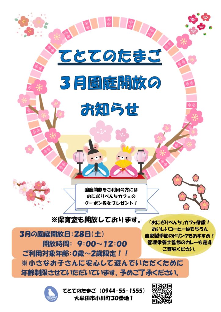 てとてのたまご:3月園庭開放のご案内 2026年2月28日 てとてのたまご 予定イベント 3月の園庭開放日:28日(土)開放時間: 9:00~12:00ご利用対象年齢:0歳~2歳限定!!※小さなお子さんに安心して遊んでいただくために年齢制限させていただいています。予めご了承ください。