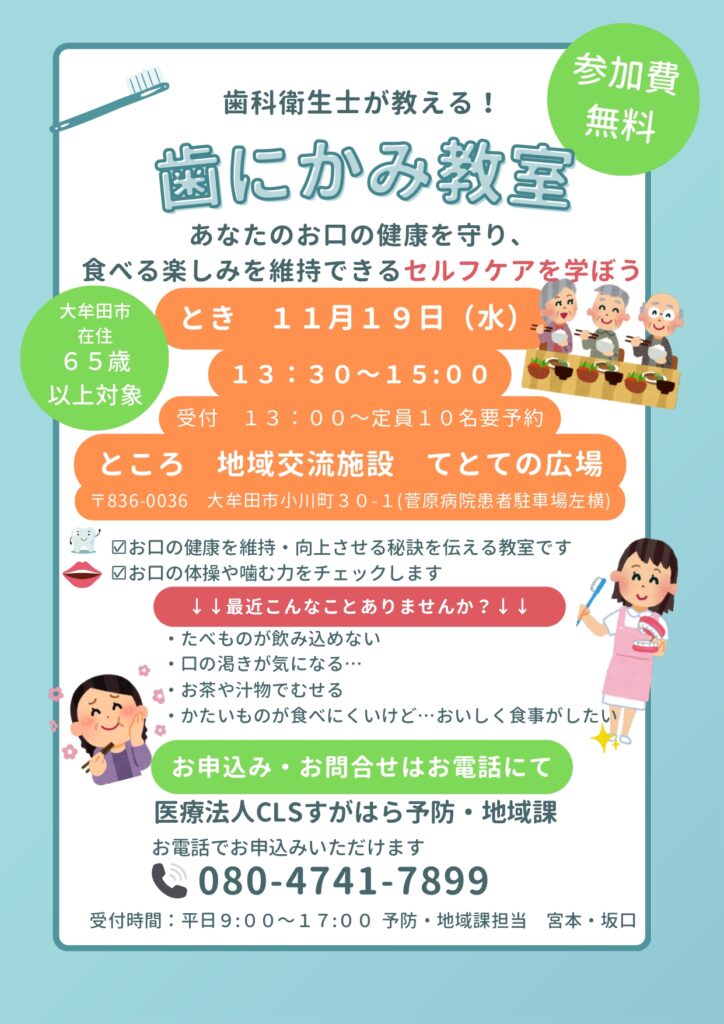 2025年11月19日、菅原病院では「歯にかみ教室」を開催いたします。対象は大牟田市在住の65歳以上の方です。