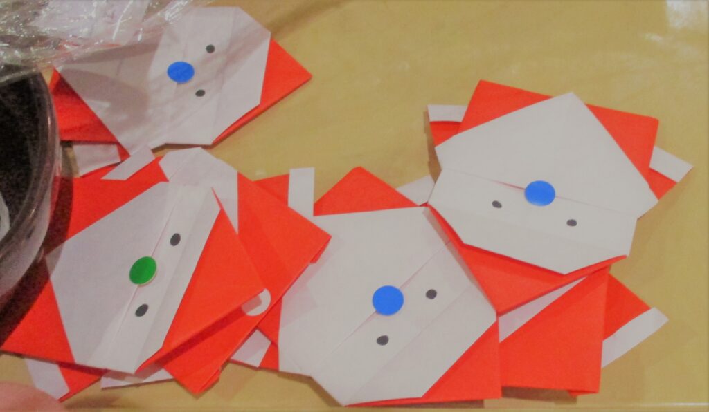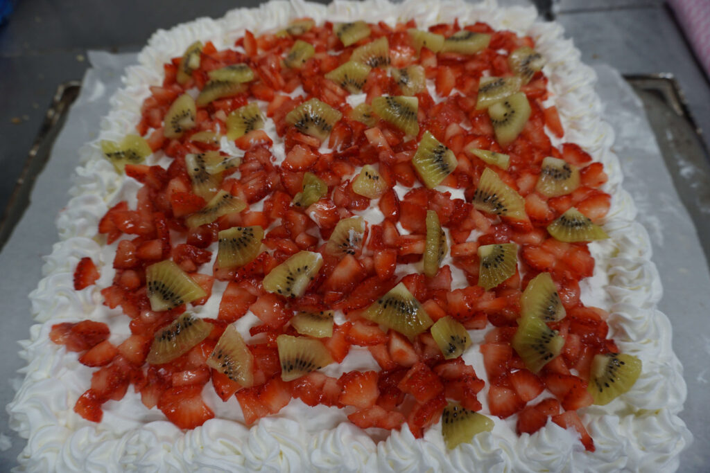 ケーキは1つひとつ丁寧に仕上げられ、栄養課のスタッフが折り紙で作ったサンタクロースを添えて提供。大きなホールケーキには色とりどりのフルーツが惜しみなく飾られ、患者様の目を楽しませました。