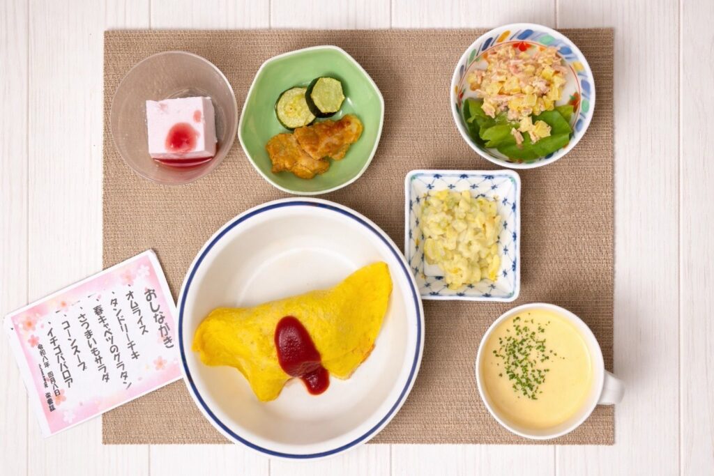 病院での食事は、栄養を摂るだけでなく、季節を感じたり、昔を思い出したりする大切な時間でもあります。今回のオムライスも、患者様にとって少しでも楽しい食事の時間となればという思いを込めて提供しました。